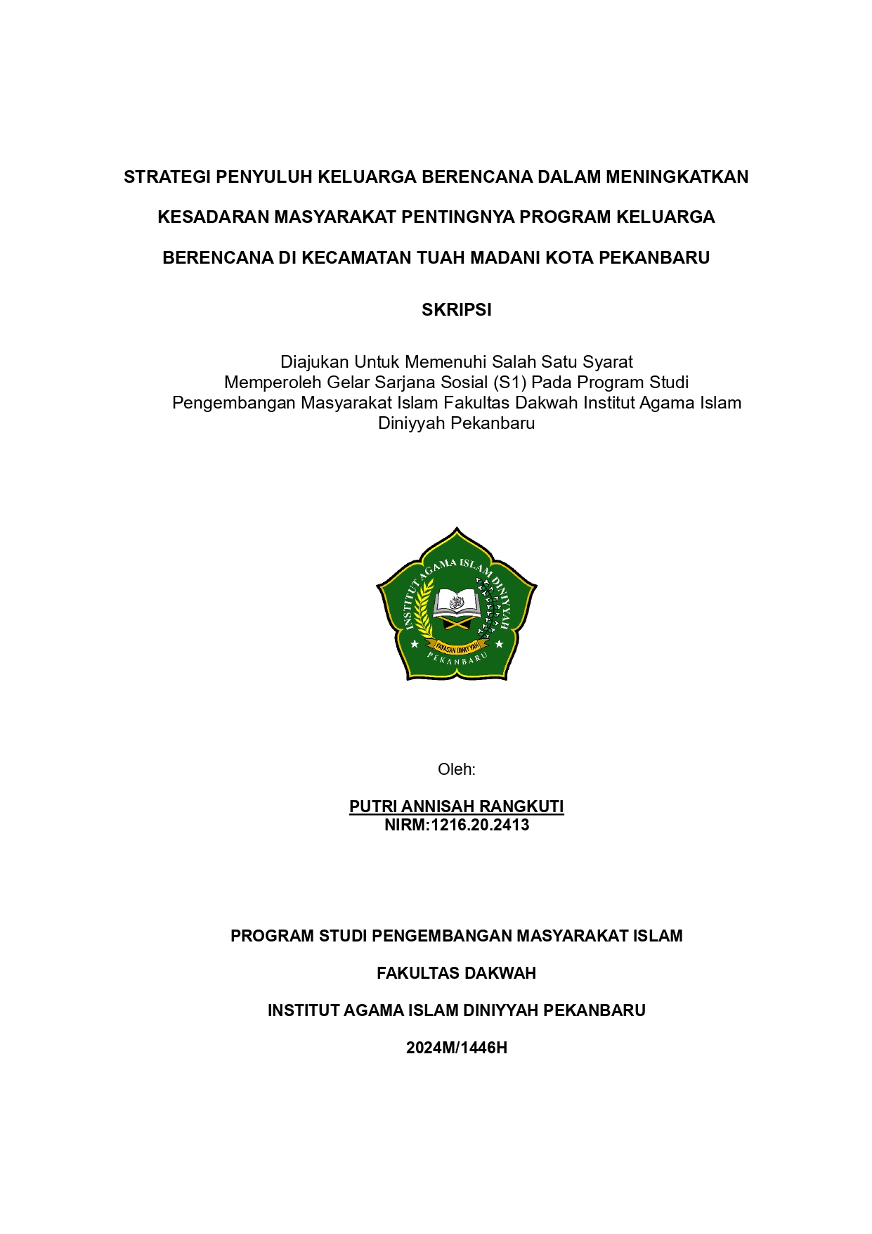 Strategi Penyuluh Keluarga Berencana Dalam Meningkatkan Kesadaran Masyarakat Pentingnya Program Keluarga Berencana Di Kecamatan Tuah Madani Kota Pekanbaru Negara Indonesia menjadi salah satu negara yang menghadapi masalah kependudukan. Masalah kependudukan yang dihadapi Indonesia saat ini yaitu tingginya pertumbuhan penduduk yang disebabkan oleh kelahiran. Program KB memungkinkan pasangan suami istri atau pasangan usia subur untuk dengan mudah membatasi jumlah anak dan mengatur jarak antar anak. Namun, di beberapa daerah masih terdapat beberapa kendala dalam pelaksanaan program tersebut dan masih banyak Pasangan Usia Subur (PUS) yang belum siap untuk berpartisipasi dalam program keluarga berencana terutama penduduk di kecamatan Tuah Madani, hal inilah yang menjadi latar belakang masalah dalam penelitian ini. tujuan dari penelitian untuk mengetahui strategi yang digunakan oleh penyuluh Keluarga Berencana dalam meningkatkan kesadaran masyarakat di kecamatan Tuah Madani tentang pentingnya program KB. Penelitian ini menggunakan metode kualitatif, dengan metode pengumpulan data Wawancara, observasi, dan dokumentasi. Hasil penelitian ini strategi yang digunakan oleh Penyuluh Keluarga Berencana ialah 1) Strategi penyuluhan dengan melakukan pendekatan personal dan komunikatif melalui sosialisasi materi dan diskusi tanya jawab, pendekatan teknologi dengan pemanfaatan media Whatsapp, dan juga evaluasi hambatan dan kendala yang diakukan secara berkala 2) Strategi bimbingan yang dilakukan dengan pendataan, Pendekatan kepada akseptor dan dengan melakukan follow up dan pendampingan.